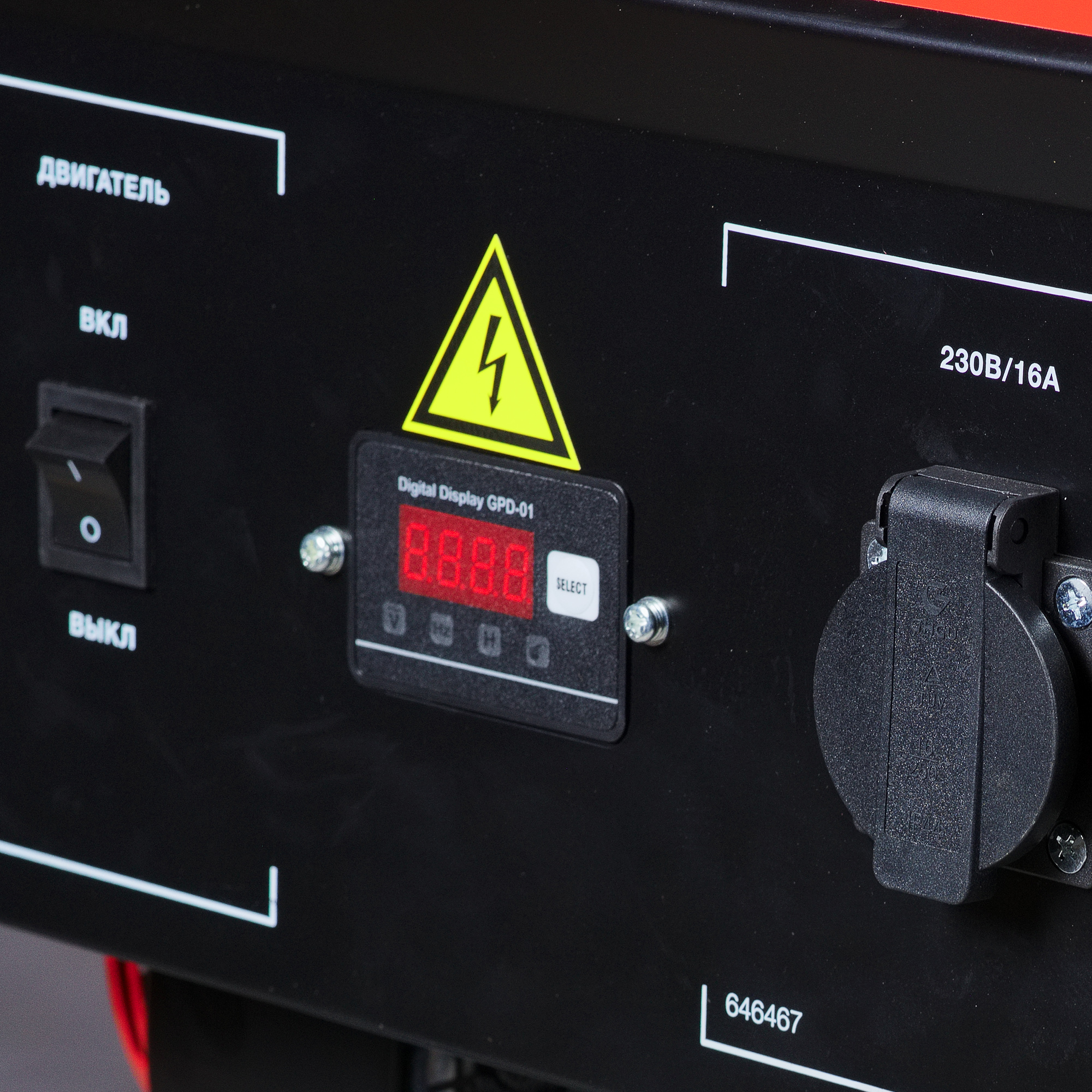 • Многофункциональный цифровой дисплей отображает напряжение, частоту, количество отработанных моточасов и индикацию уровня масла;